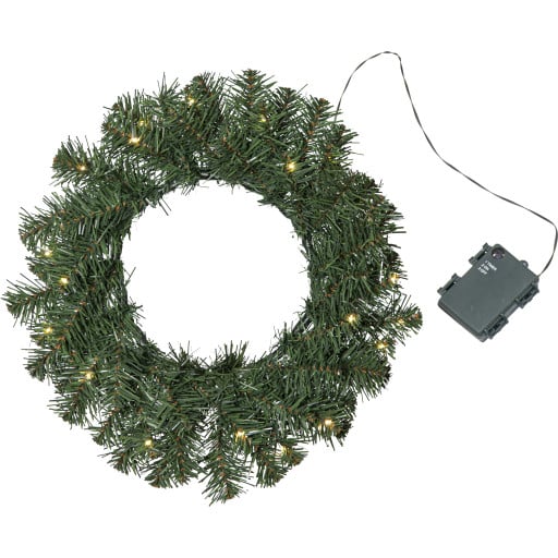 Kunstig julekrans med varm belysning og timer til både inde og ude Skab en varm velkomst i juletiden med denne stemningsfulde julekrans fra Star Trading. Med sit tætte og naturtro gran-look samt 20 små varmhvide LED-lys spreder den ro og hygge på selv de