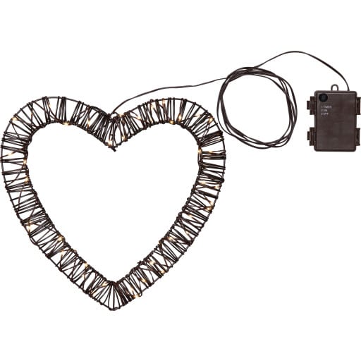 Dekorativ hjerte med lys – udendørs og indendørs belysning Star Trading Vicke er et stemningsfuldt lysende hjerte på 30 cm, designet med en robust metalramme indviklet i brun kunstrotting. De 50 varmhvide LED-pærer giver et blødt skær, der skaber hygge bå