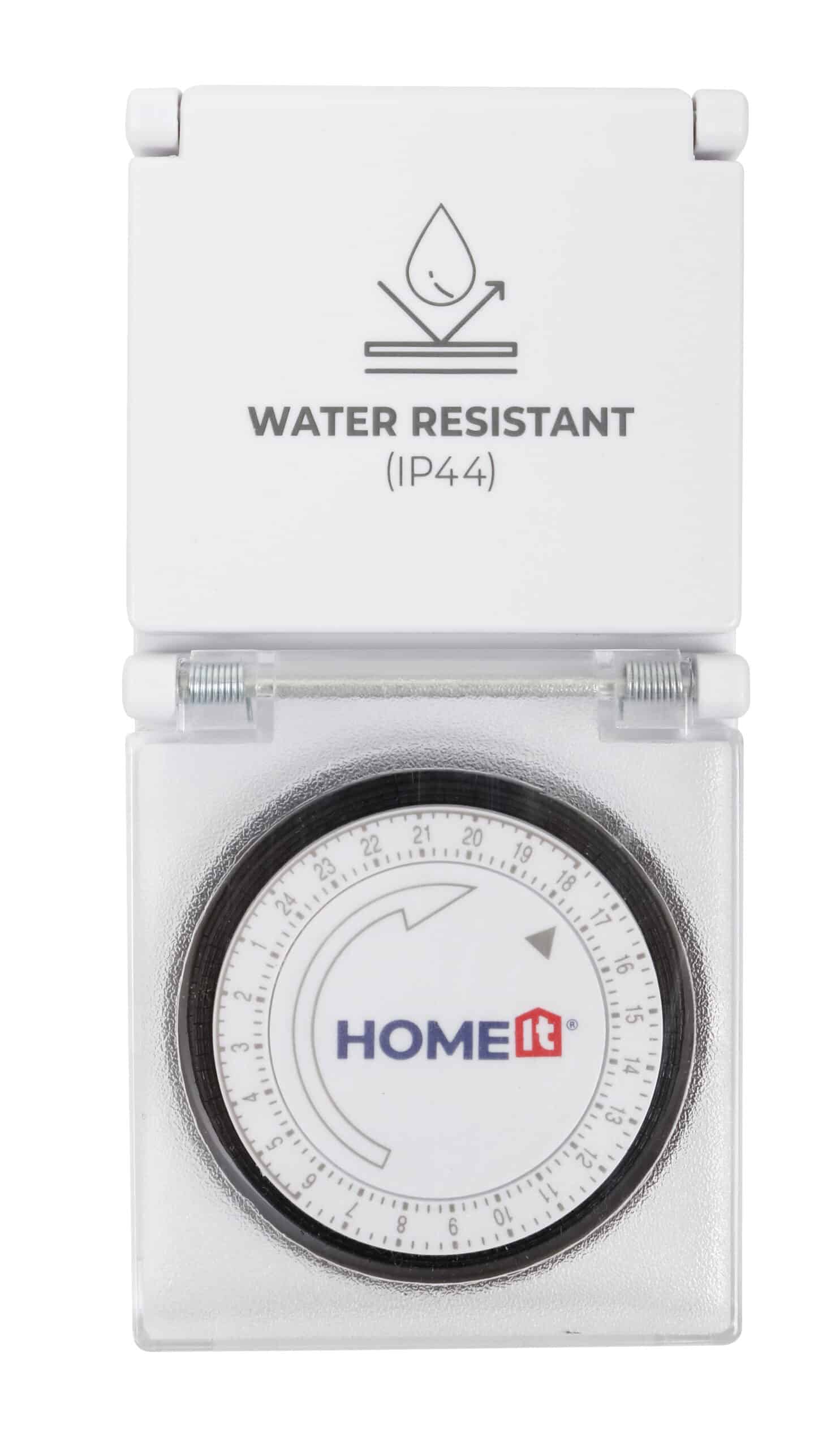 Mekanisk tænd/sluk-ur/timer, som kan bruges både indendørs og udendørs til eksempelvis at tænde og slukke for eksempelvis julebelysning eller udendørsbelysning og springvand i haven.